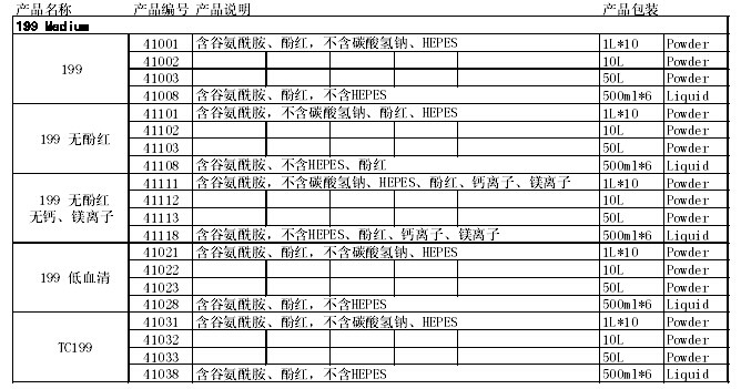 本厂生产的199培养基为含酚红,无酚红,无酚红、无钙镁离子,低血清和TC199培养基五种。